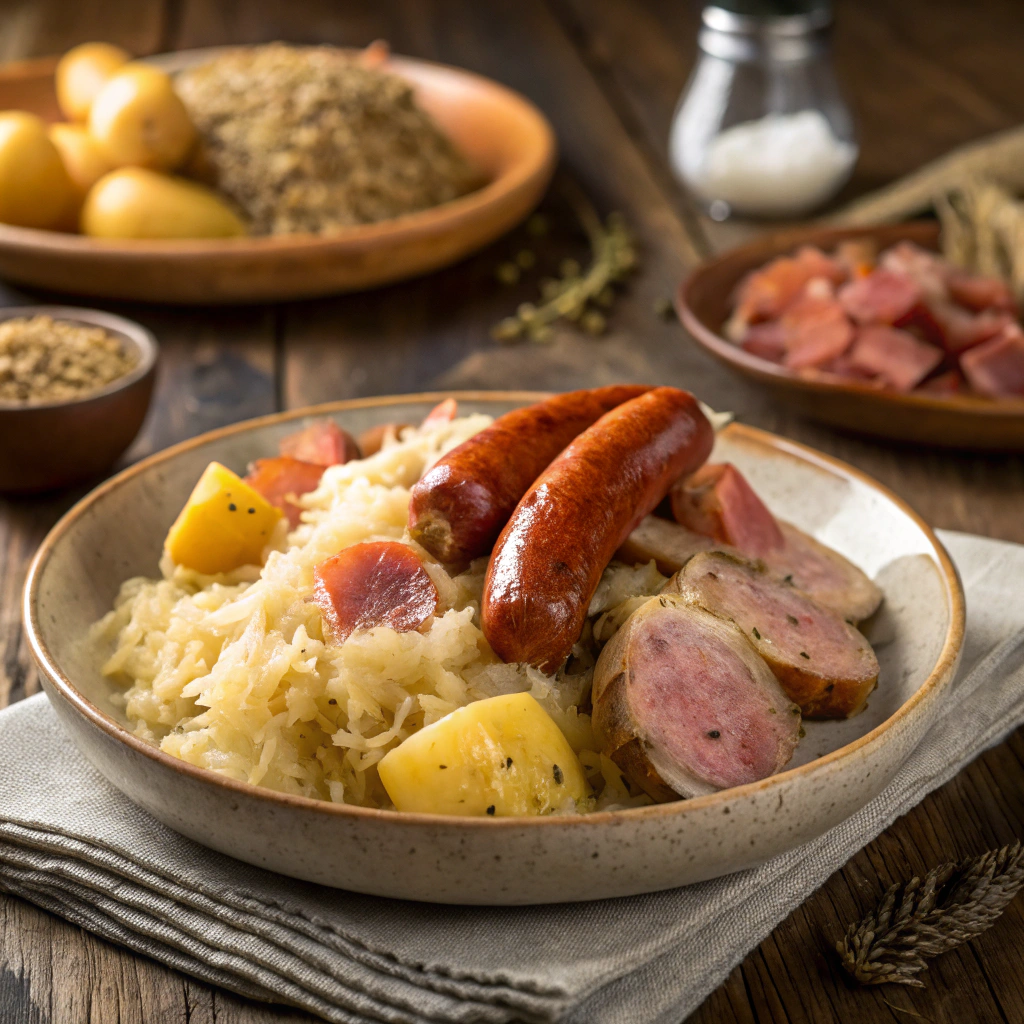 Plongez dans les saveurs authentiques de l’hiver avec notre choucroute garnie maison — sans pommes de terre, pour ceux qui préfèrent l’essentiel.